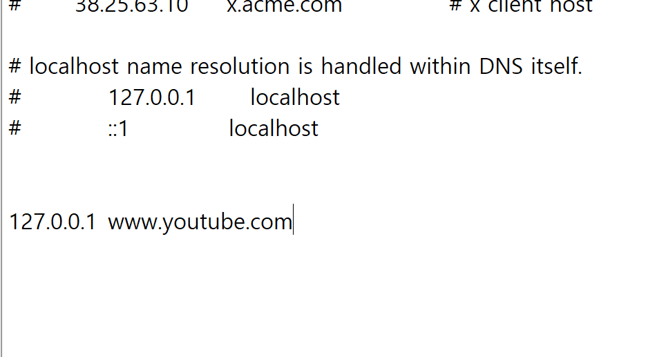 2. 메모장 하단에 127.0.0.1 를 입력하고 tab으로 한 칸 띄운 뒤 차단하고 싶은 사이트 주소를 입력해라.